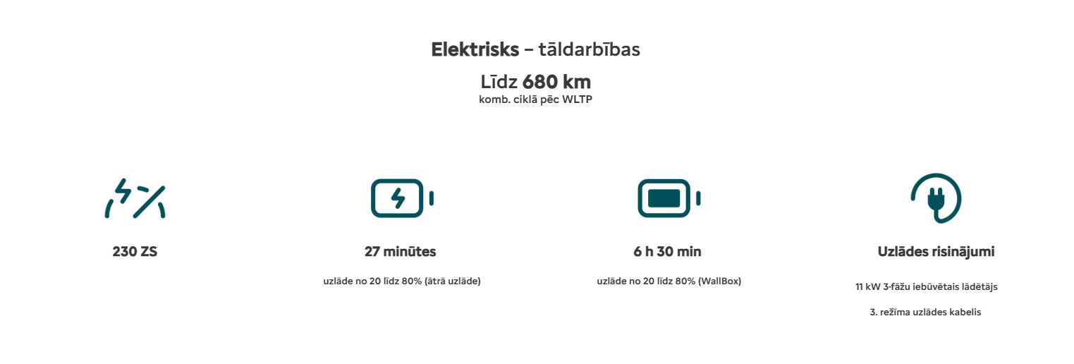 - 230 ZS Long Range (tāldarbības autonomijas) versija ar 97 kWh akumulatoru piedāvā autonomiju līdz 680 km