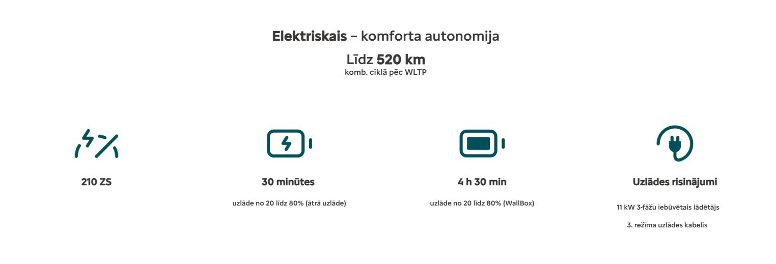 - 210 ZS Comfort Range (komforta autonomijas) versija ar 73 kWh akumulatoru piedāvā autonomiju līdz 520 km